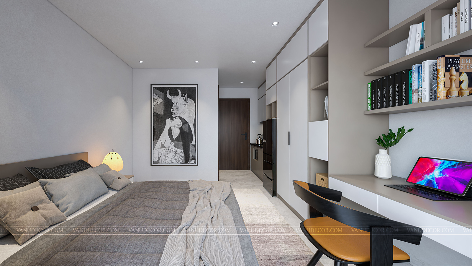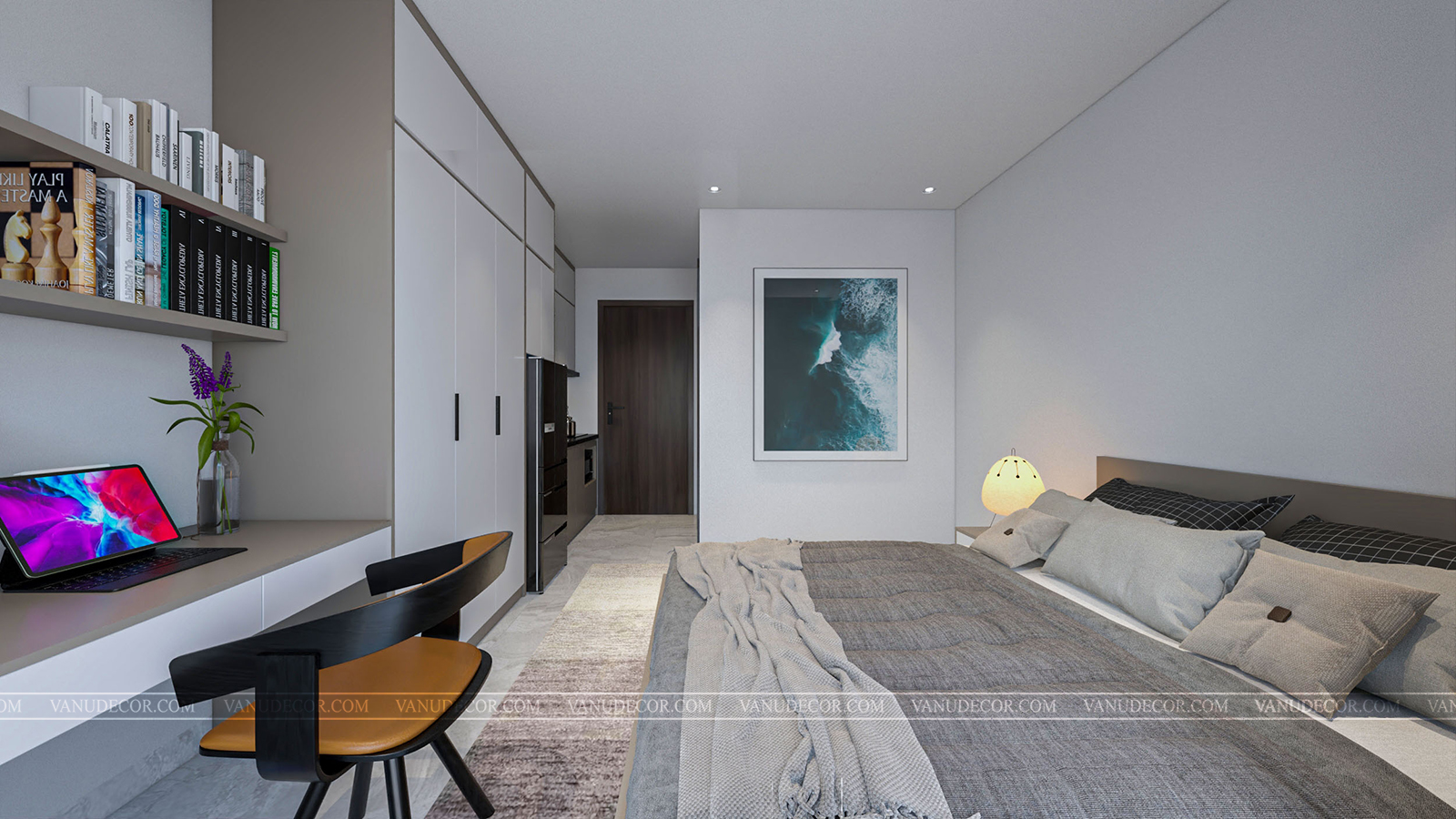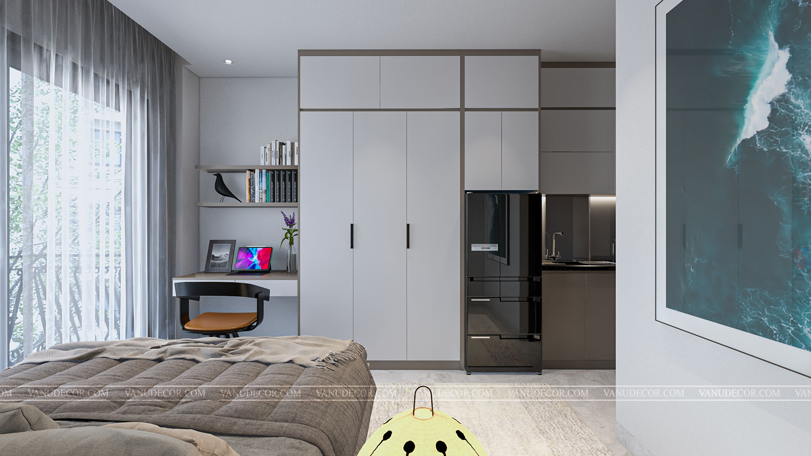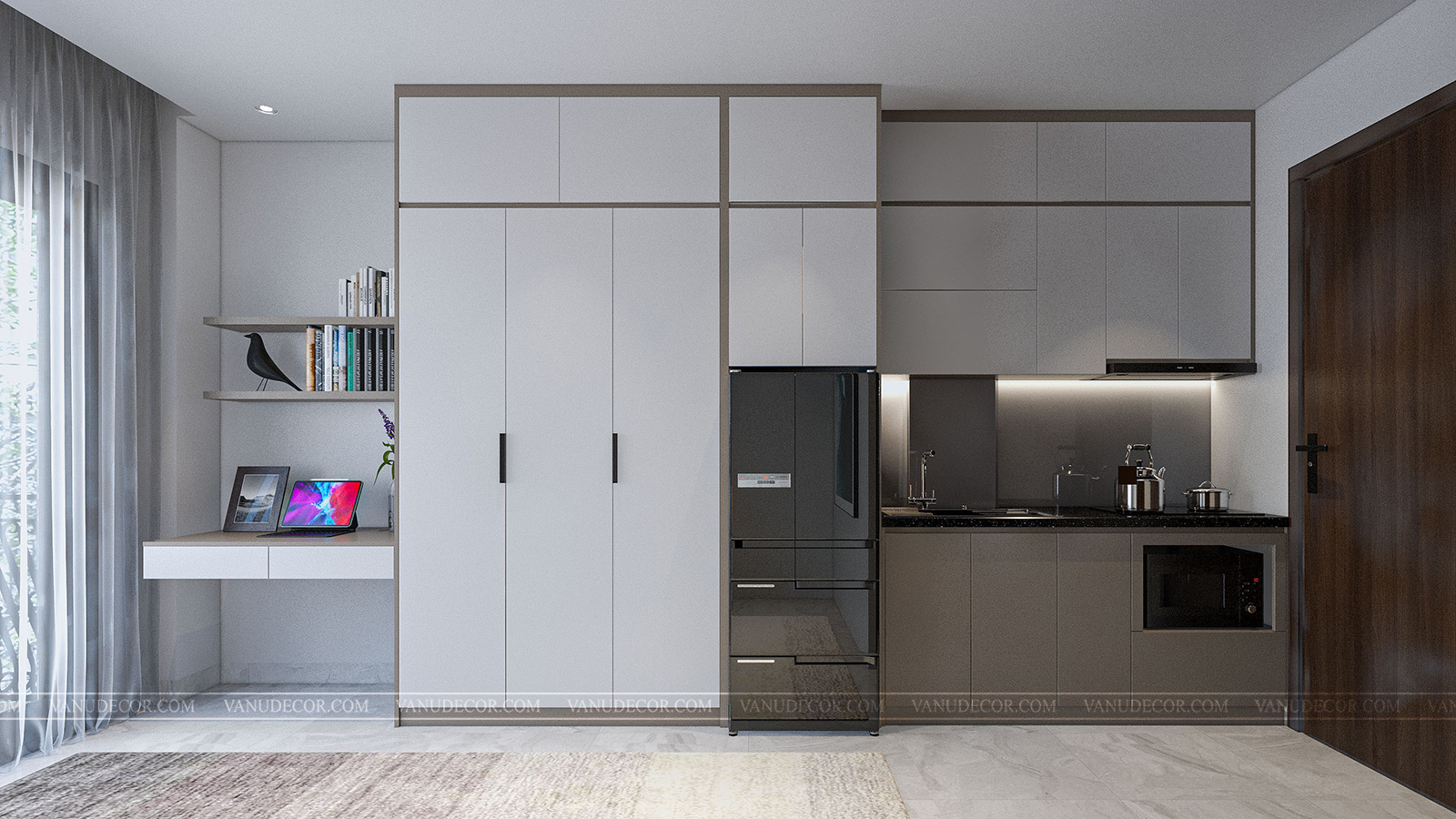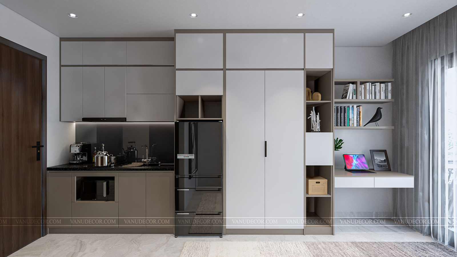 Khách hàng: Anh Quốc Địa chỉ: Chung cư mini Hà Nội Diện tích: 50m2 Hạng mục: Phòng bếp, phòng ngủ Chất liệu chủ đạo: Gỗ MDF chống ẩm An Cường phủ melanine |