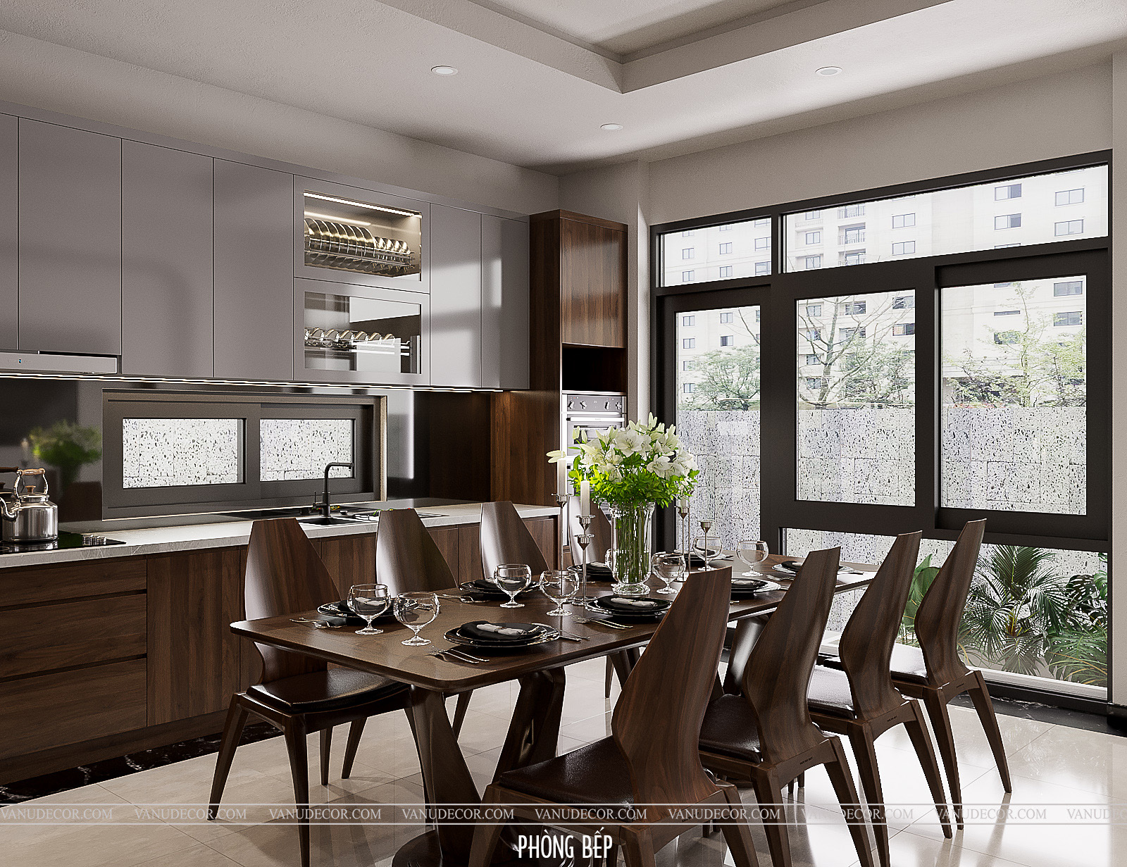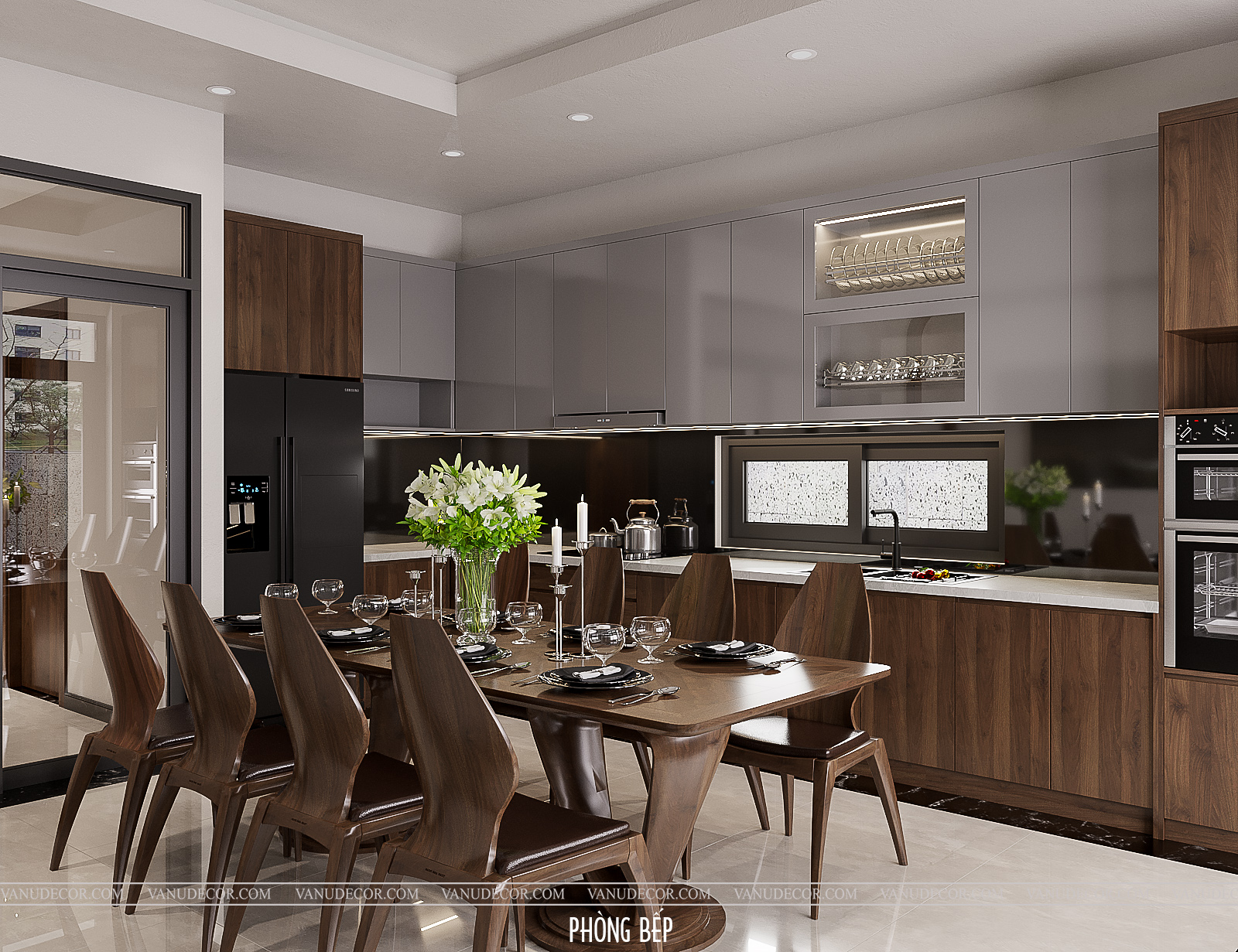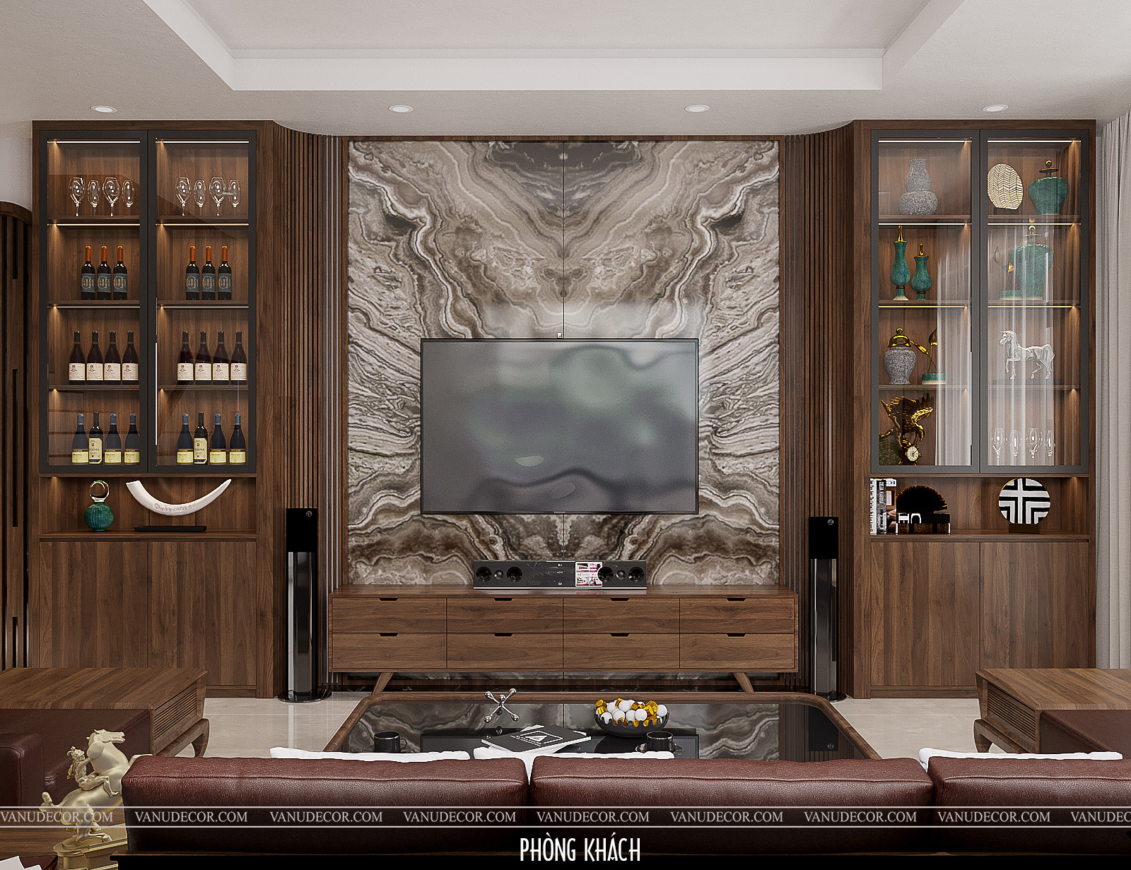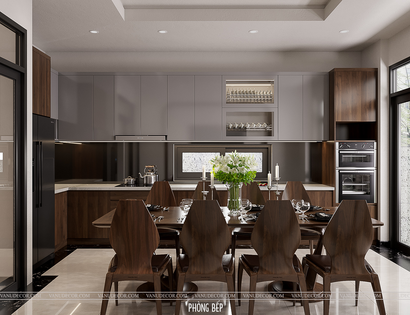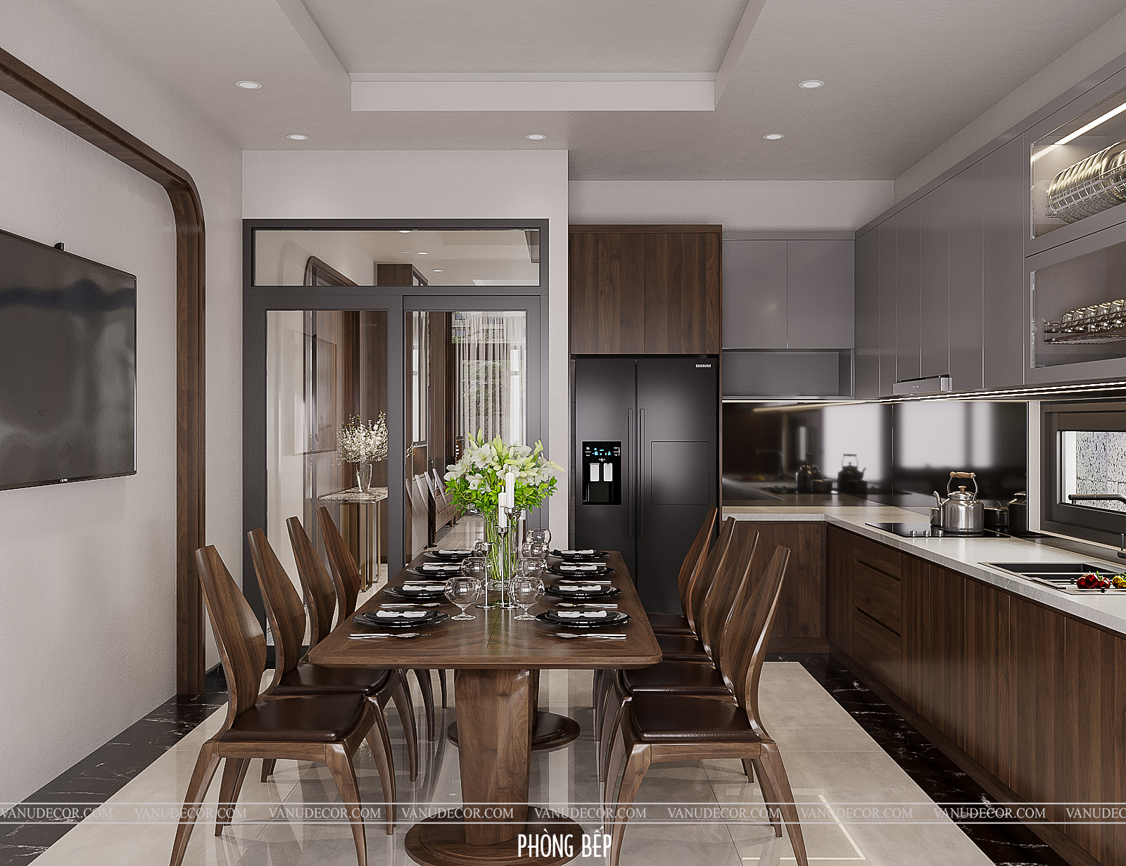 Khách hàng: Chú Trường Địa chỉ: Nhà phố Hà Nội Diện tích: 200m2 Hạng mục: Phòng khách, bếp và phòng ngủ Chất liệu chủ đạo: Gỗ óc chó kết hợp gỗ MDF chống ẩm An Cường phủ melanine |
