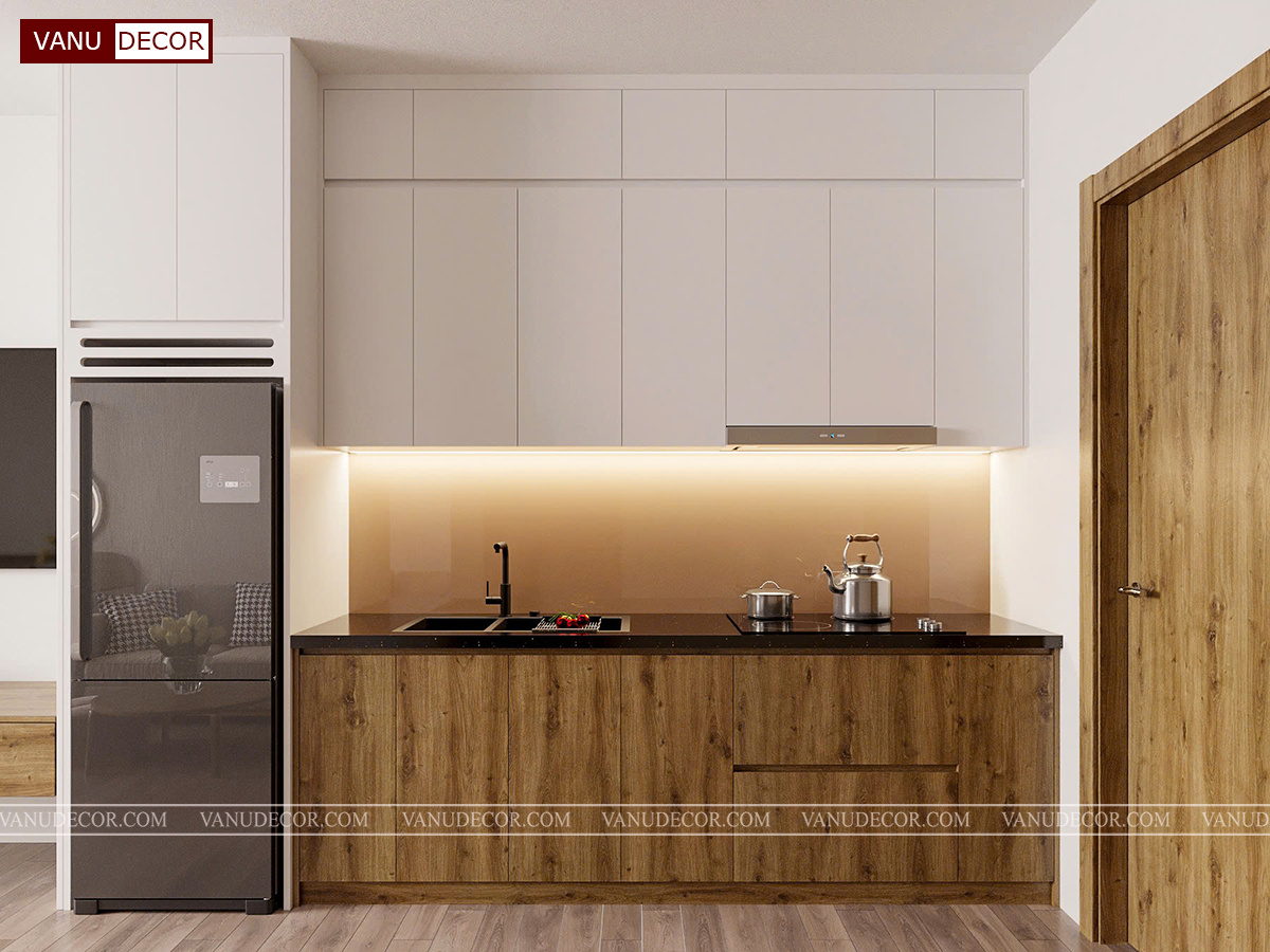 | Khách hàng: Chị Thủy Địa chỉ: Studio Ecopark, Hưng Yên Diện tích: 70m2 Hạng mục: Phòng khách bếp, phòng ngủ Chất liệu chủ đạo: Gỗ MDF chống ẩm An Cường phủ melanine |