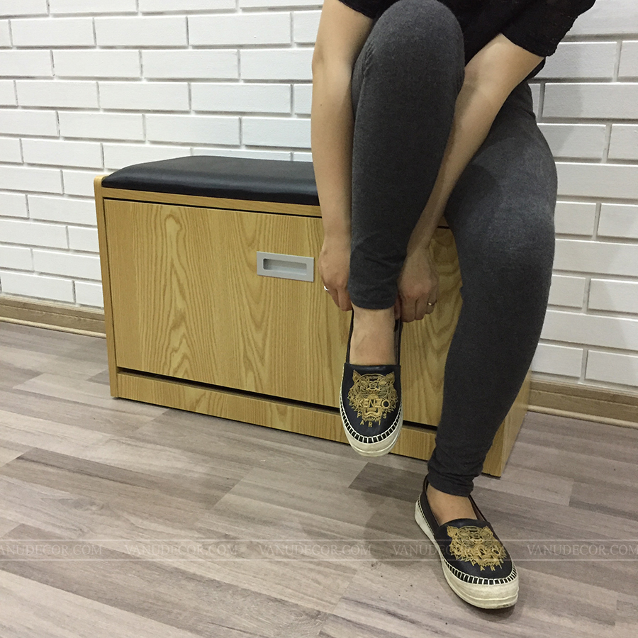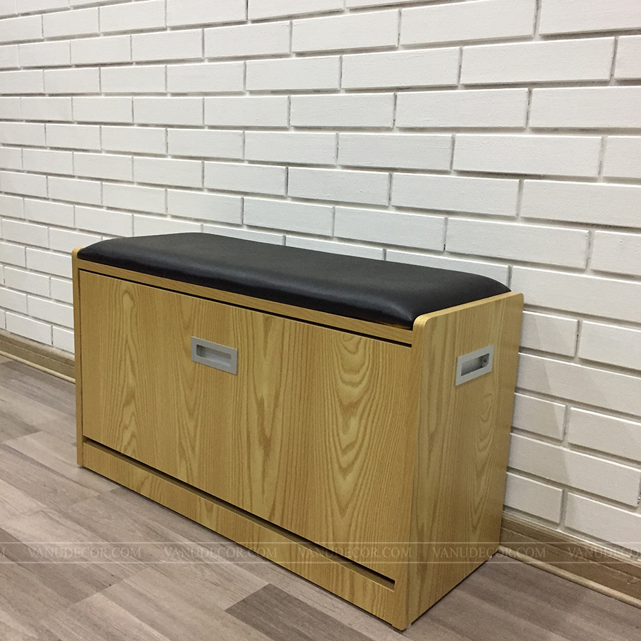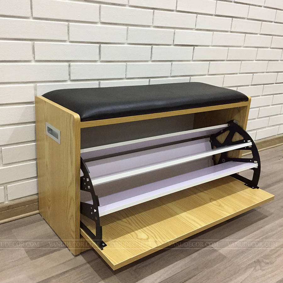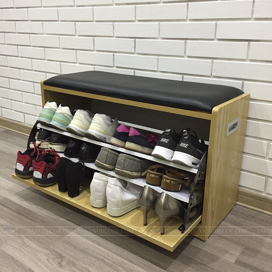 Tủ giày TG043 có kích thước nhỏ gọn: Dài 80cm x Cao 43cm x Sâu 30cm. Chất liệu: Gỗ MDF chống ẩm phủ melanine chống trầy xước rất tốt. Màu sắc đa dạng phù hợp với mọi không gian nội thất của gia đình, toàn bộ màu vân gỗ hoặc kết hợp với cánh màu trắng: Màu vân gỗ mun - Màu vân gỗ óc chó - Màu vân gỗ sồi - Màu trắng. Tủ gồm một ngăn cánh xoay 3 tầng, có thể để được đến 12 đôi giày, trên có đệm ngồi tiện lợi.